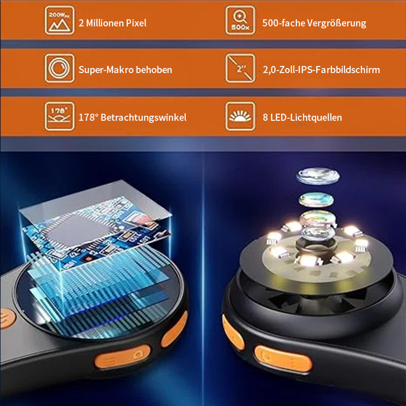 • 200-W-HD-Pixel: 2,0-Zoll-IPS-HD-Farbbildschirm mit realistischen Farben und 178° Betrachtungswinkel. Im Vergleich zu herkömmlichen Lupen schüttelt dieses Mikroskop Ihre Augen nicht und verringert die Ermüdung der Augen.